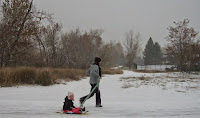 Once you get away from the traffic noise, the quiet is something special. The snow acts as a sound-deadener. The bike tires make a slight crunching sound... off in the distance comes the occasional enthusiastic honking of a dozen or fifty Canada geese. (I wish I understood goose - is it happy sound? Or is it unhappy? Are they encouraging one another, or complaining to one another?) The occasional rippling of river rapids. At one point a mommy came jogging by, with a pretty little princess pulled behind on a sled. The princess was obviously very happy.